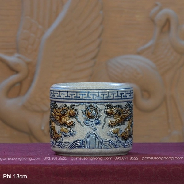 Bát Hương Men Rạn 18cm Đắp Nổi Song Long Chầu Nguyệt