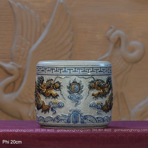 Bát Hương Men Rạn 20cm Đắp Nổi Song Long Chầu Nguyệt