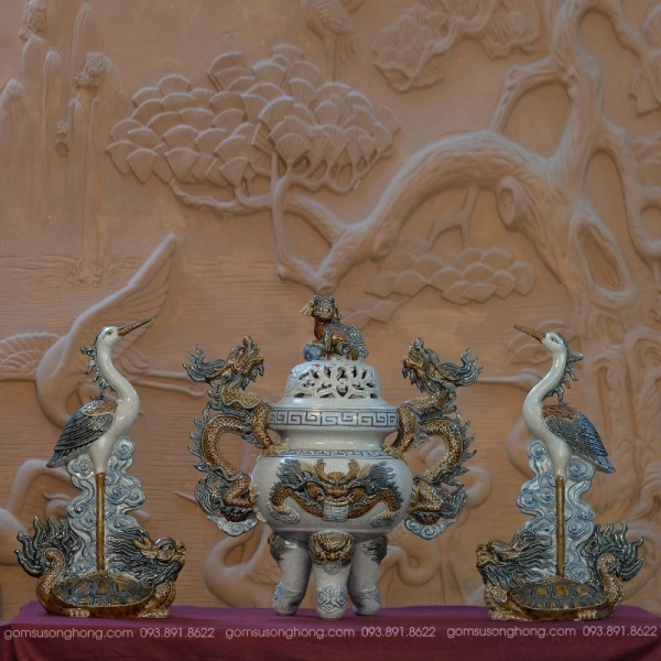 Bộ Đỉnh Hạc Lư Hương Men Rạn Đắp Nổi