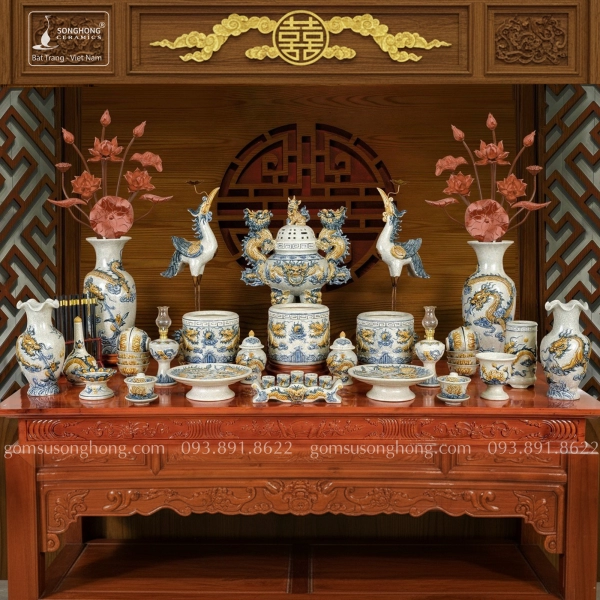 Bộ đồ thờ ngũ sự men rạn đắp nổi cao cấp của SonghongCeramics cho ban thờ 2m17