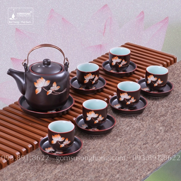 Bộ Trà (Ấm Chén) Khắc Tay Men Nâu Hoa Sen 400ml - Mẫu 1