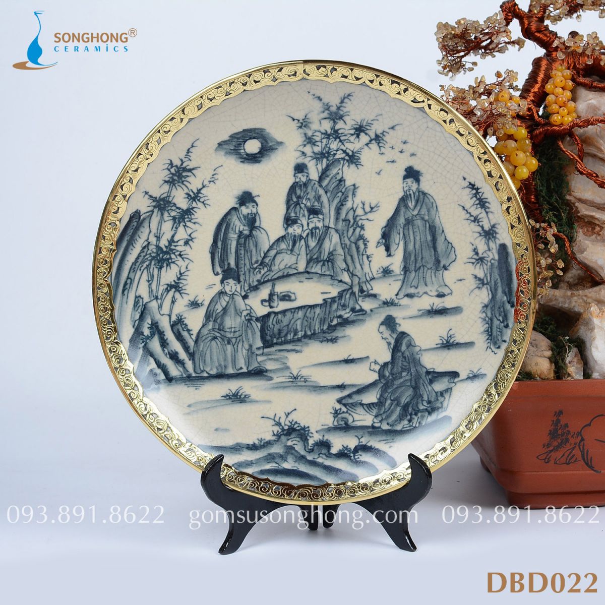 Tranh Đĩa gốm sứ men rạn bọc đồng cao cấp vẽ tích Trúc Lâm Thất Hiền