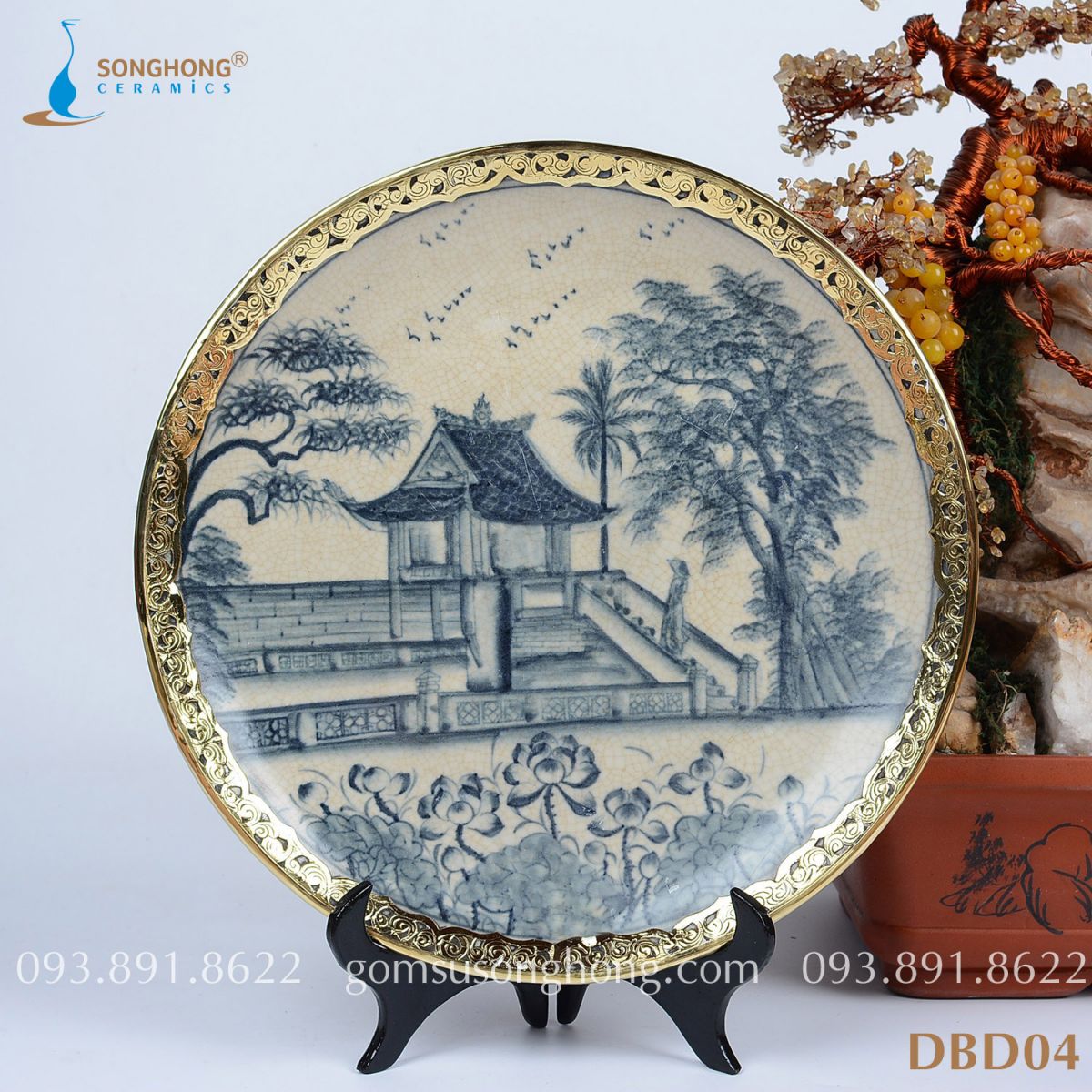 Tranh Đĩa gốm sứ men rạn bọc đồng cao cấp vẽ cảnh Chùa Một Cột