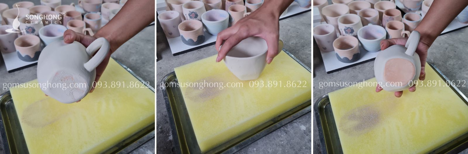 - Khi lau men đáy sản phẩm chỉ nên lau 1 bên, bên còn lại để lau sạch bước cuối đối với sản phẩm có phần đáy quá nhiều men.