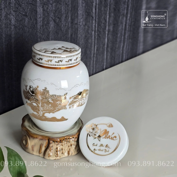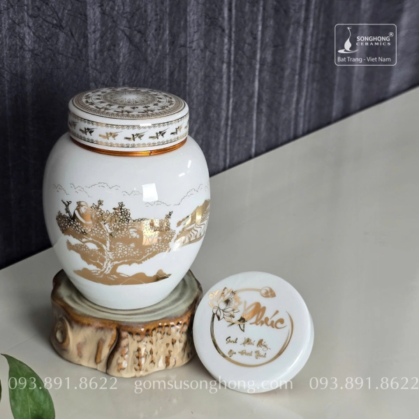 Thành phần: Đất sét trắng, men màu, họa tiết trang trí bằng vàng kim, nắp hợp kim mạ vàng đảm bảo kín khít, nắp gốm sứ bên ngoài.
