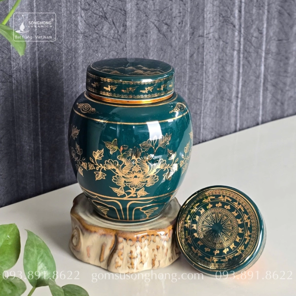 Hũ Sứ Đựng Trà 480ml Xanh Lục Bảo Cảnh Hoa Mẫu Đơn