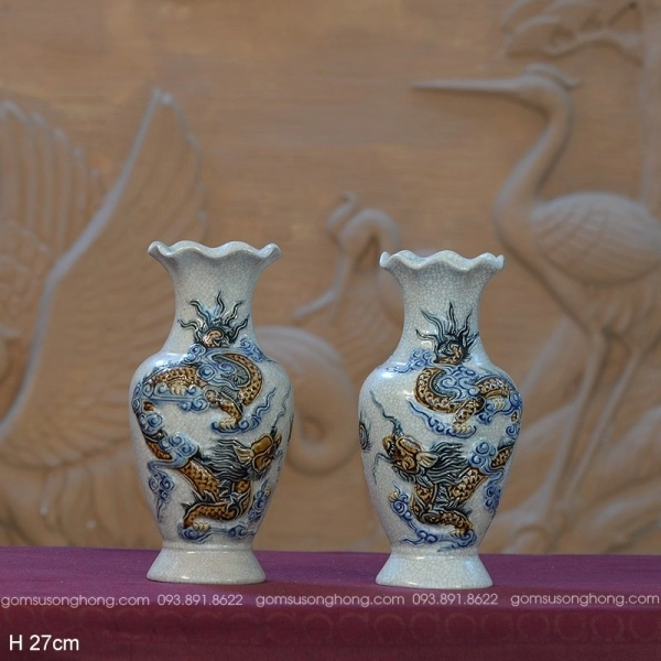 Lọ Miệng Lượn H27cm Men Rạn Đắp Nổi Song Long Chầu Nguyệt