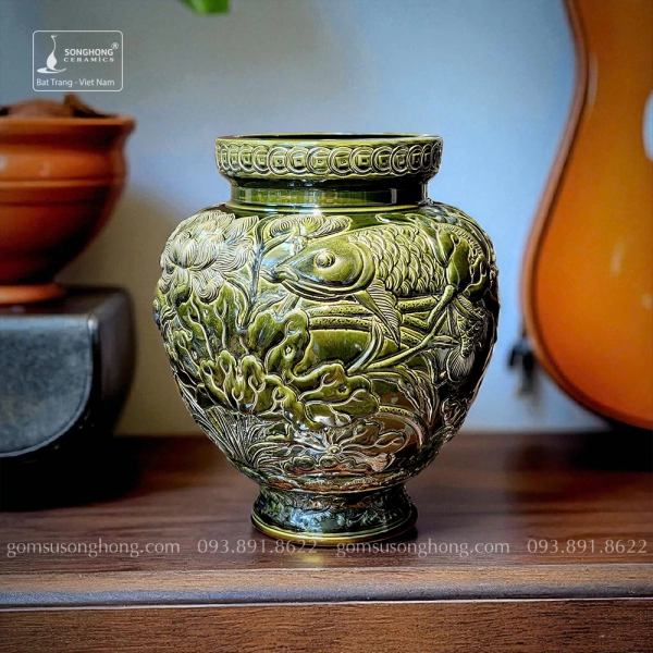 Bình Hoa Gốm Men Hoàng Thổ Xanh Khắc Nổi Sen Cá - Mẫu 2