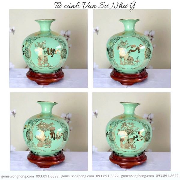 Bình Hút Lộc Vạn Sự Như Ý Xanh Ngọc Bích Vẽ Vàng Kim - Mẫu 2