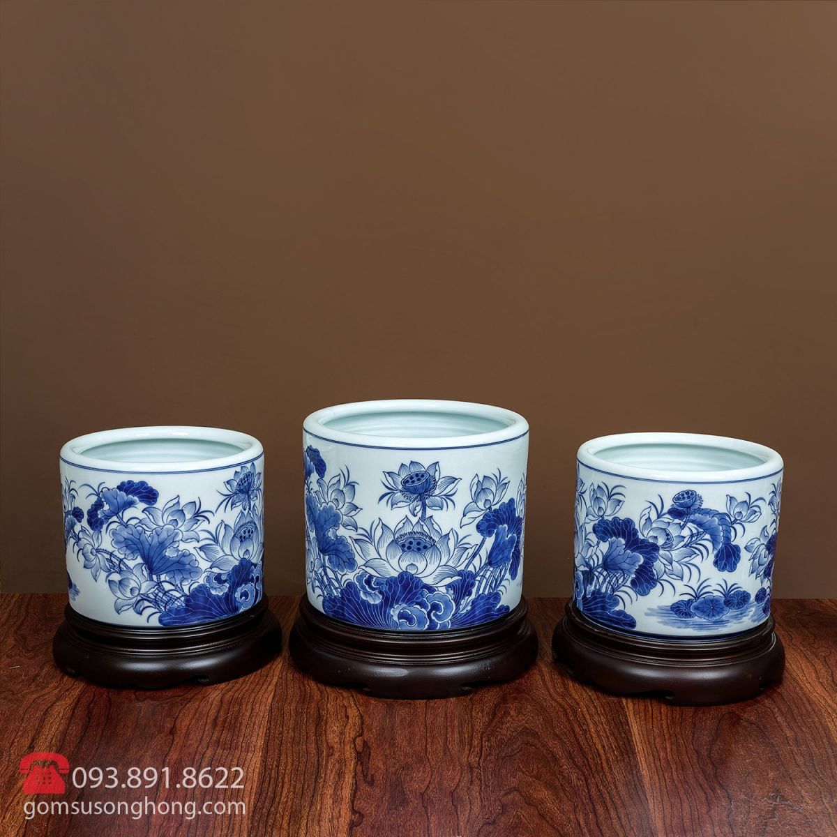 Bộ Bát Hương Vẽ Sen - Men Rong Cổ Truyền