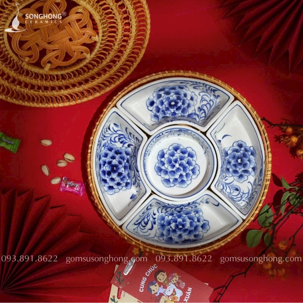 - 05 khay gốm vẽ tay - 01 bộ giỏ mây đan tay kèm nắp