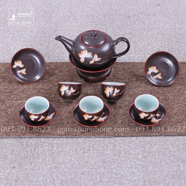 Bộ Trà (Ấm Chén) Khắc Tay Men Nâu Hoa Đào 300ml - Mẫu 2