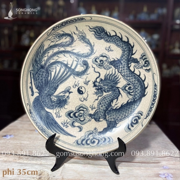 Tranh Đĩa gốm sứ men rạn giả cổ vẽ tích Long Phụng Sum Vầy