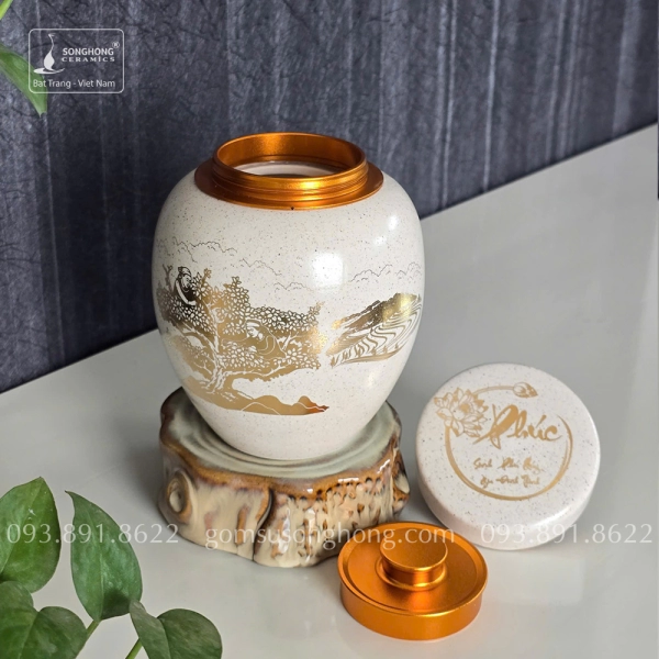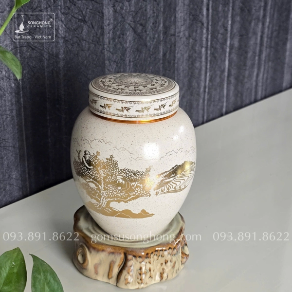 Hũ Sứ Đựng Trà 480ml Men Tiêu Cảnh Trà Cổ Thụ Vàng Kim