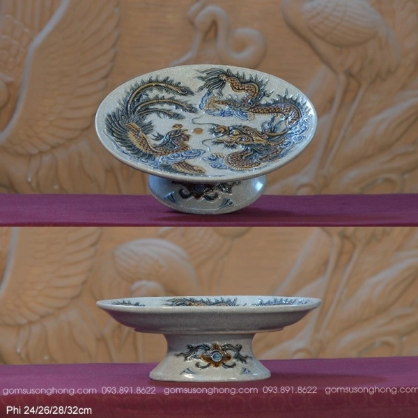 Mâm Bồng Men Rạn Đắp Nổi Rồng Phượng